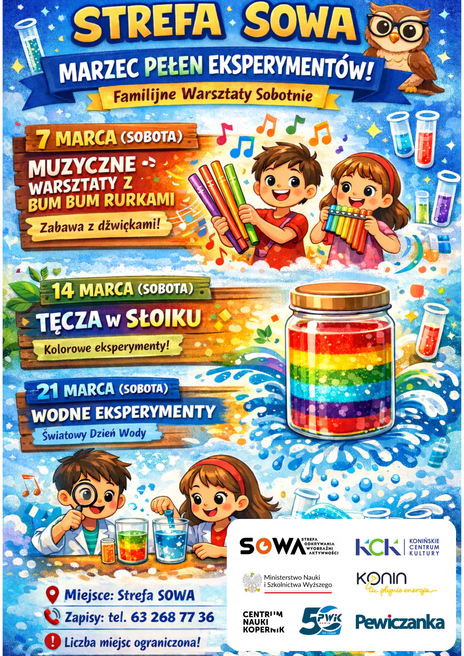 Przedsiębiorstwo Wodociągów i Kanalizacji Sp. z o.o. z siedzibą w Koninie zaprasza na Familijne warsztaty naukowe z okazji Światowego Dnia wody, które odbędą się 21 marca o godzinie 14:00 w Strefie SOWA przy ul. Leopolda Staffa 5. Organizatorzy przygotowali dla uczestników kolorowe, naukowe i wiosenne doświadczenia m.in.: kolorowe wodne wulkany, znikającą sowę, żywe kwiatki i bańkę w bańce. To będzie niezwykła okazja do tego, aby wspólnie odkrywać niezwykłe zjawiska i eksperymenty z wodą.